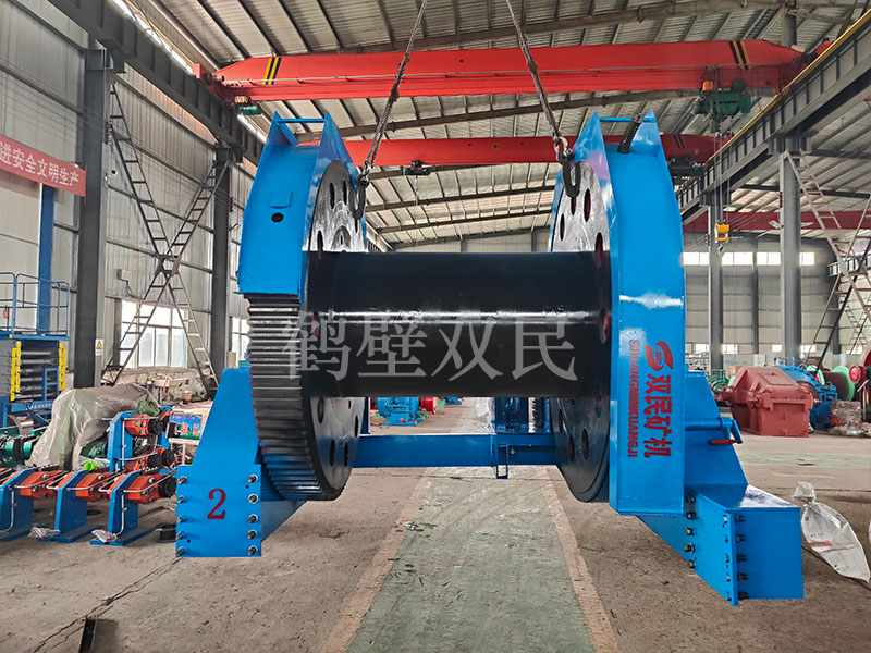 本絞車(chē)主要用于煤礦、金屬礦和非金屬礦豎井井筒掘進(jìn)時(shí)懸吊吊盤(pán)、水泵、水管、注漿泵、風(fēng)筒等掘進(jìn)設(shè)備和張緊穩(wěn)繩,該絞車(chē)系雙鋼絲繩懸吊。將減速機(jī)上的差動(dòng)手把放在差動(dòng)位置,若張緊穩(wěn)繩,可使兩根穩(wěn)繩的張緊力保持相等;若懸吊水管、注漿管、風(fēng)筒等管類(lèi)設(shè)備,可保證其被懸吊管類(lèi)設(shè)備與地面保持垂直的狀態(tài)。如果懸吊吊盤(pán)等盤(pán)狀設(shè)備,需將其差動(dòng)手把放在直通位置,才能實(shí)現(xiàn)兩繩繩速的一致。