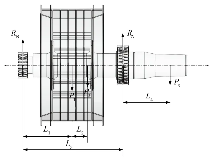 圖2 中,P1 為鋼絲繩動張力;P2 為主軸重力 +摩擦輪重力;P3 為電動機重力+磁拉力;L1 為非電動機端軸承中 心線到提升機摩擦輪中 心線的距離,L1=1 870 mm;L2 為提升機摩擦輪中 心線到重 心的距離;L3 為非電動機端軸承中 心線到電動機端軸承中 心線的距離,L3=3 800 mm;L4 為電動機端軸承中 心線到電動機中 心線的距離,L4=1 850 mm;RA 為非電動機端 (非傳動側(cè)) 軸承承受的支反力,數(shù)值與軸承所受徑向力相同,方向相反;RB 為電動機端 (傳動側(cè)) 軸承承受的支反力,數(shù)值與軸承所受徑向力相同,方向相反。