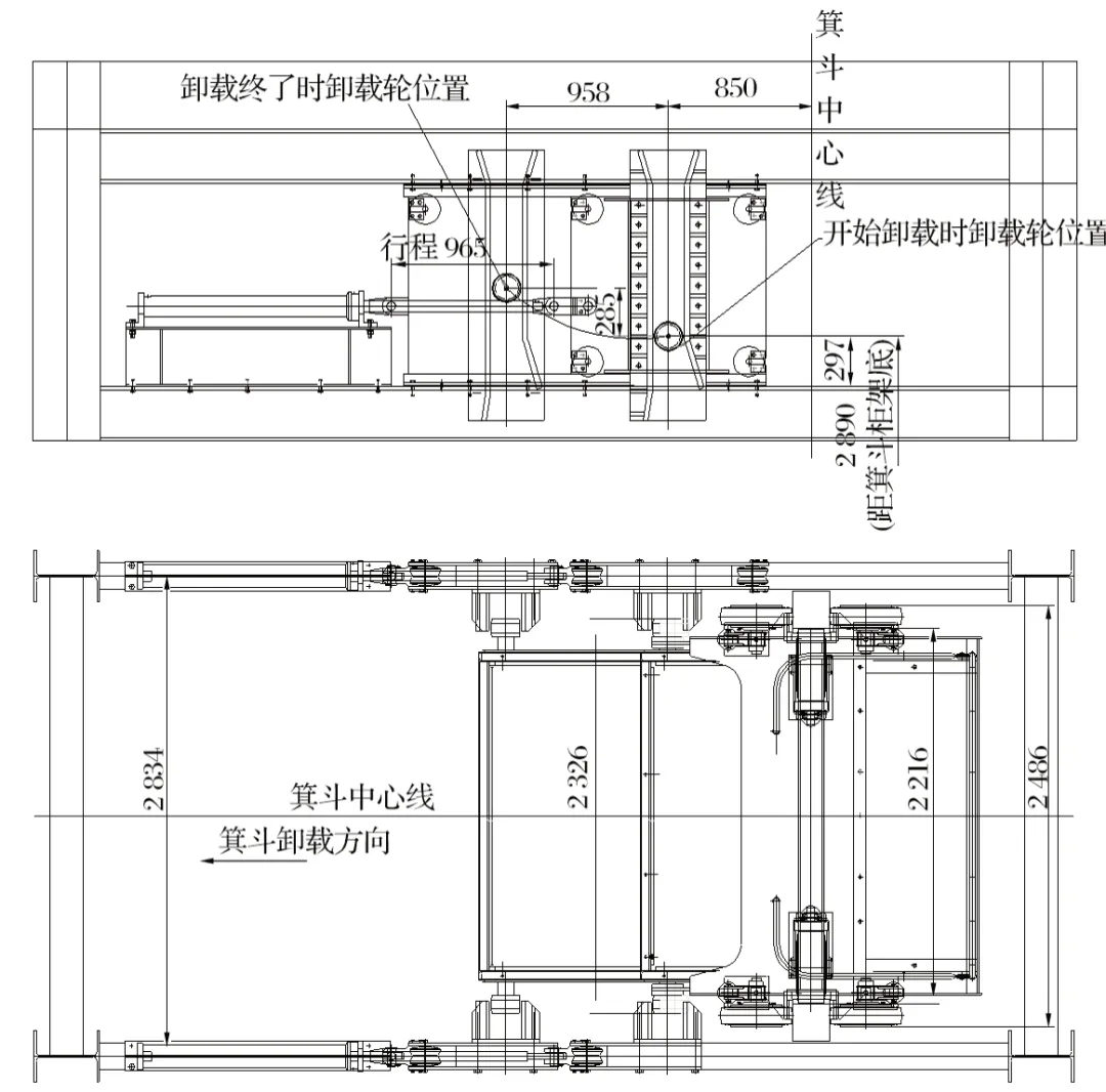 (2)這種2個(gè)卸礦點(diǎn)應(yīng)用在同一箕斗的卸礦方式在我國尚屬shou 次,會(huì)澤礦3號(hào)豎井是目前wei 一在用的雙卸載點(diǎn)礦井。一般的礦井一個(gè)井筒采用一個(gè)卸礦點(diǎn),多個(gè)水平的多點(diǎn)卸礦一般要打多個(gè)井筒。為了多點(diǎn)卸礦功能的順利實(shí)現(xiàn),移動(dòng)直軌到位精度偏差不能超過±5 mm,并且應(yīng)滿足鋼絲繩正常的彈性變形伸縮量的卸載要求。多點(diǎn)卸礦為礦山開采節(jié)約了大量成本,移動(dòng)直軌卸載裝置如圖2所示。