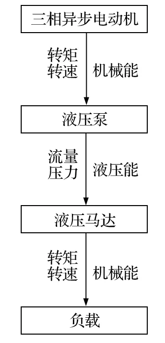 換繩機構采用雙液壓馬達驅動,以帶動同步帶輪和鏈輪轉動,進行送繩,其能量傳遞過程如圖3所示。在整個能量傳遞中,受排量、效率、液壓等因素的影響,液壓馬達輸出轉矩會產(chǎn)生波動。因此,需要通過公式推導得出輸出轉矩的波動函數(shù)。