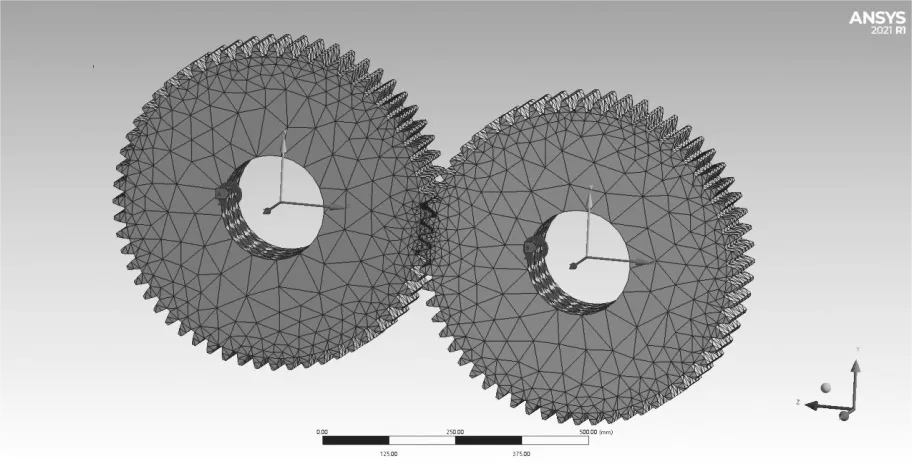 選用 ANSYS/Workbench 中的瞬態(tài)動力學模塊,對同步齒輪的嚙合過程繼續(xù)動態(tài)仿真分析。齒輪嚙合分析主要針對齒輪的接觸壓力以及zui大等效應力特性。設置同步齒輪嚙合仿真時間為0.3s,選取28個齒面進行14對接觸,接觸類型為摩擦接觸,摩擦因數(shù)為0.2,法向剛度系數(shù)為1。根據(jù)同步齒輪的運動特性,確保齒輪只能繞 z 軸轉動。齒輪瞬態(tài)分析約束與載荷施加情況如圖8所示。